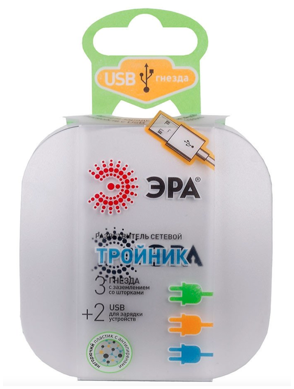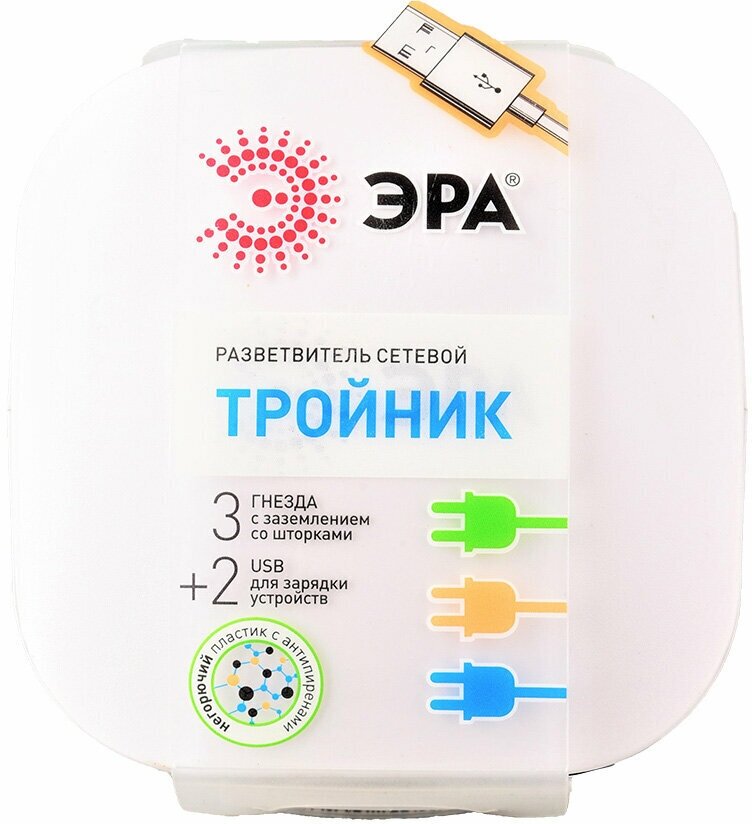 Разветвитель ЭРА +, 3 гнезда, 2 USB, с заземлением, белый
