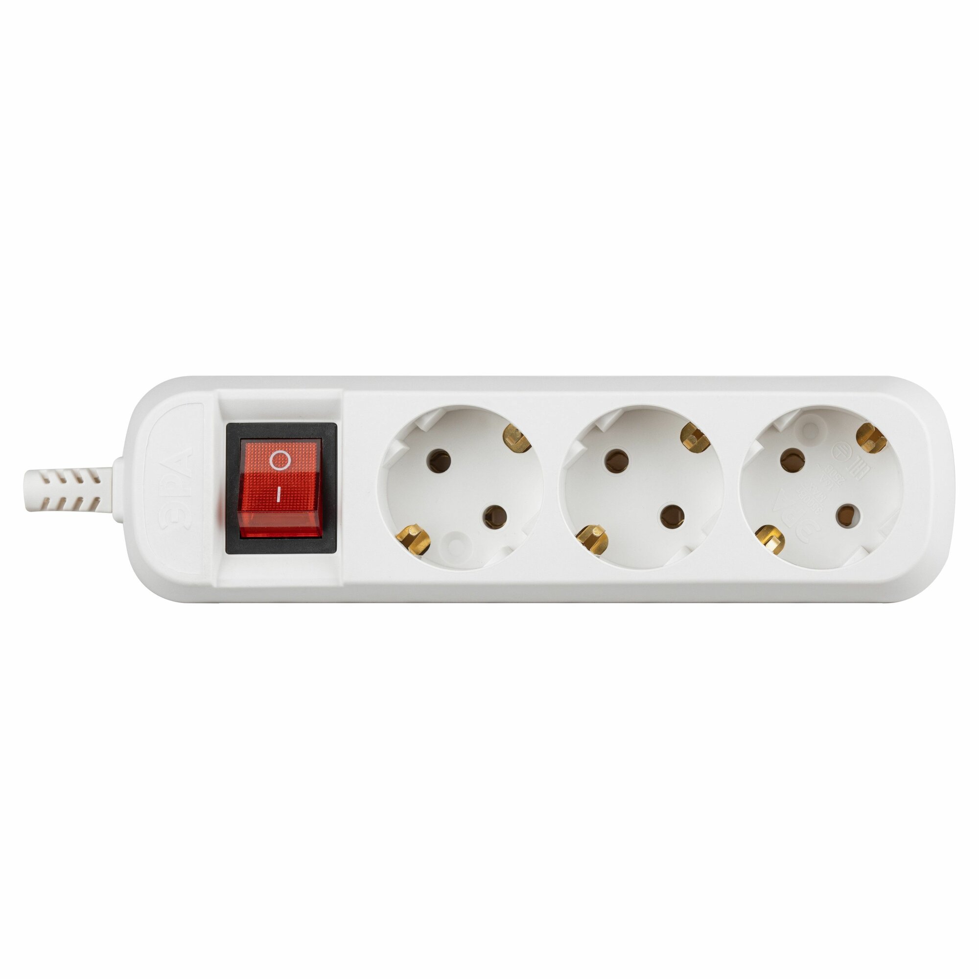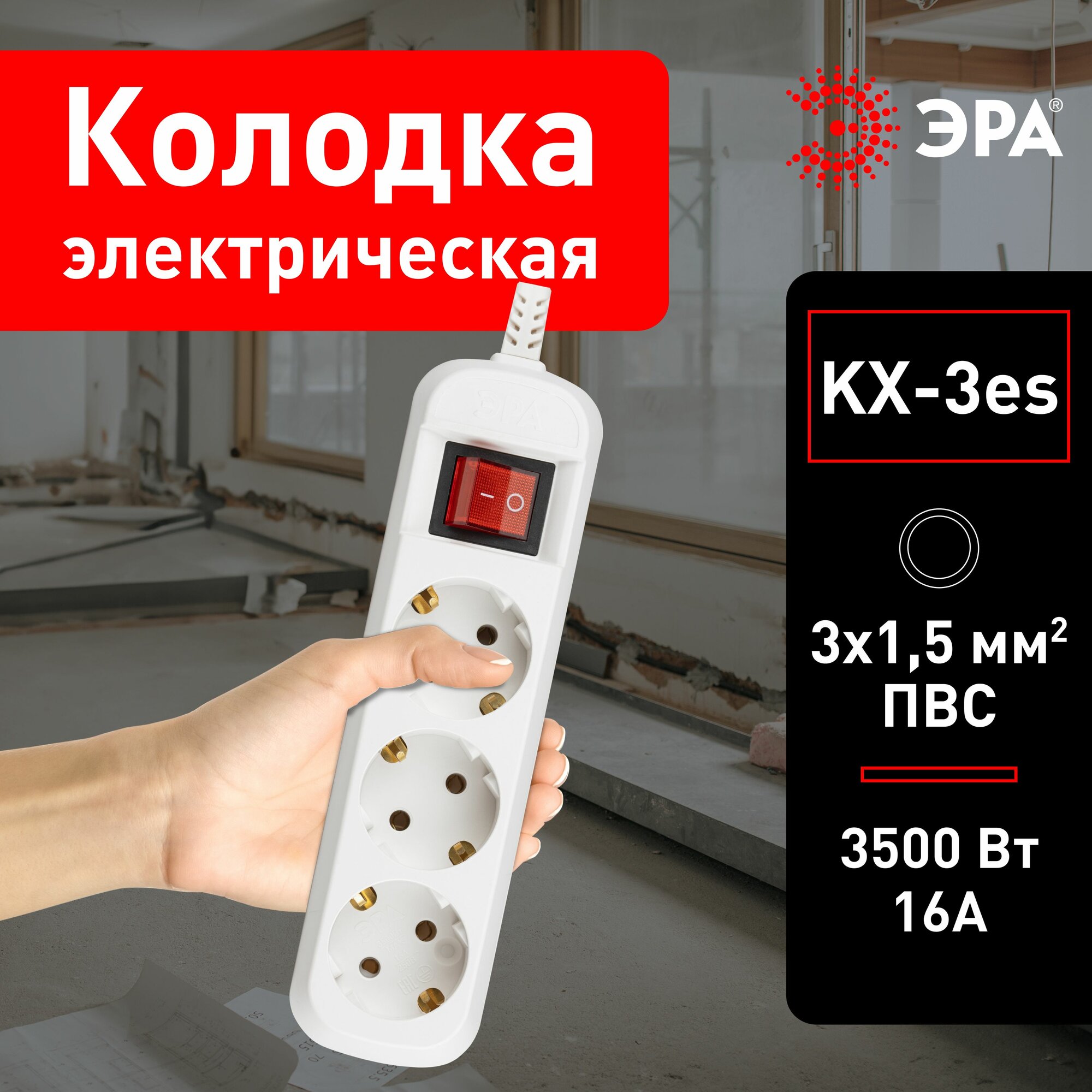 Купить Колодка для удлинителя ЭРА KX-3es с зазeмлением и выключателем 3 гнезда, 16 А, 3500 Вт, 3x1,5мм2