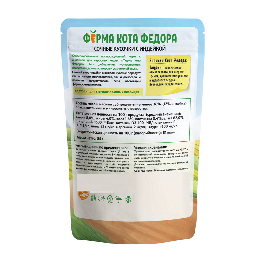 Влажный корм Ферма кота Фёдора сочные кусочки для кошек с индейкой 85г х 24 шт.