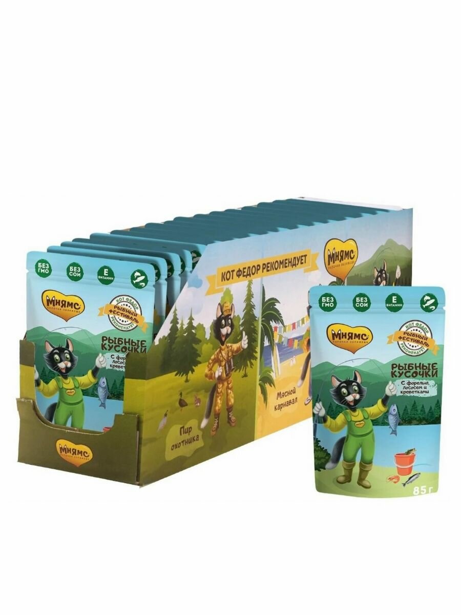 Купить Корм влажный Мнямс для кошек Рыбный фестиваль с Лососем, креветкой и форелью пауч 10 шт по 85 г