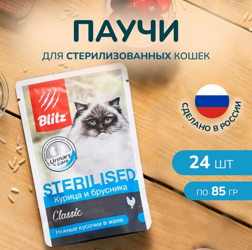Влажный корм для кошек Blitz Classic Sterilised курица и брусника, в желе,упаковка 24 шт х 85 гр