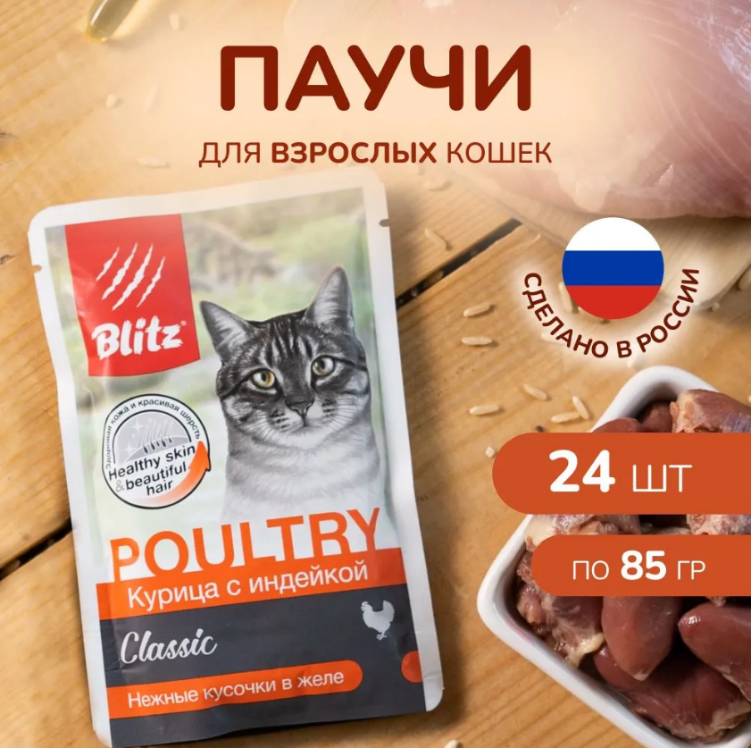 BLITZ CLASSIC для взрослых кошек с курицей и индейкой в желе пауч 85 гр 85 гр х 4 шт