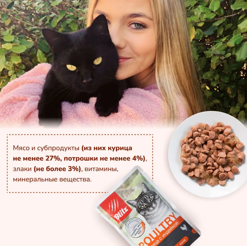 СохранитьКонсервы (паучи) BLITZ д/кошек Курица с Индейкой в желе (пауч 85гр х 24 шт) интересное: