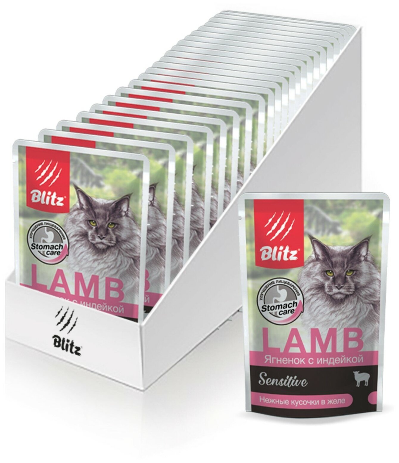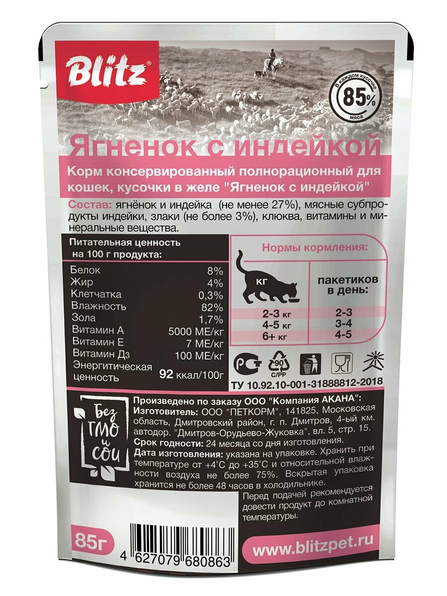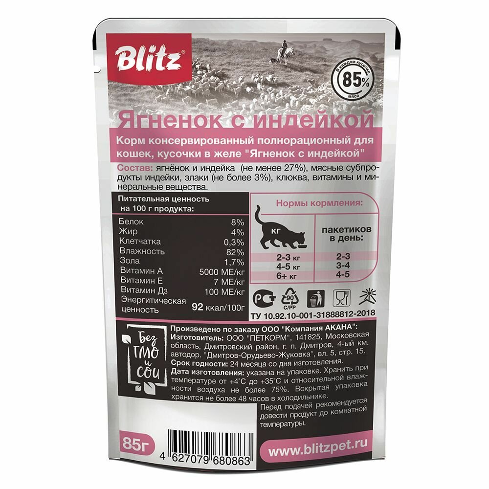 Купить Blitz влажный корм для кошек паучи ягнёнок с индейкой в желе 85г х 24шт