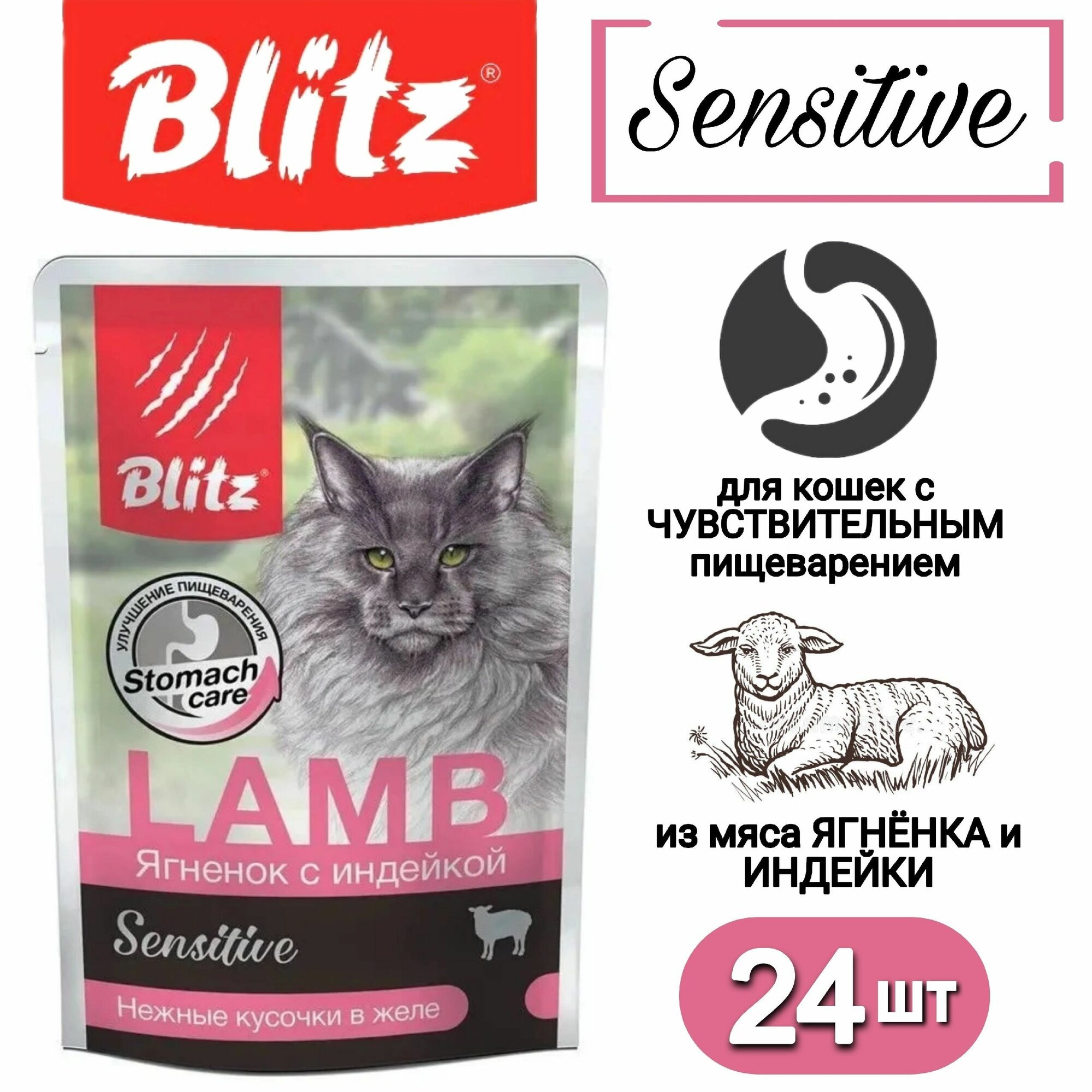 BLITZ SENSITIVE для взрослых кошек с чувствительным пищеварением с ягненком и индейкой в желе (85 гр х 24 шт)
