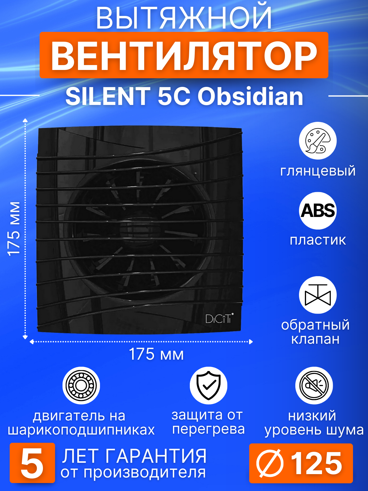 Вентилятор осевой вытяжной с обратным клапаном для кухни/ванной DICITI SILENT 5C Obsidian Черный глянец D125 10В