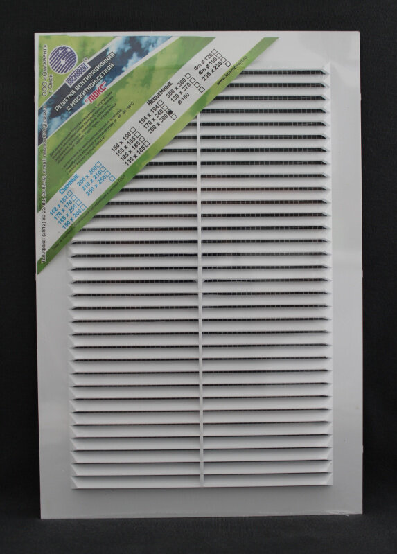 Решетка разъемная с москитной сеткой, наклонные жалюзи, 218х295 мм, белая