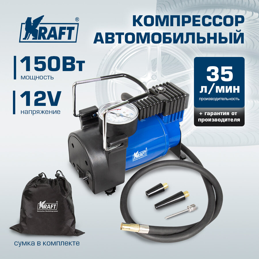Компрессор автомобильный 35 л/мин, 7 атм "KRAFT" ECO 3 насадки,сумка