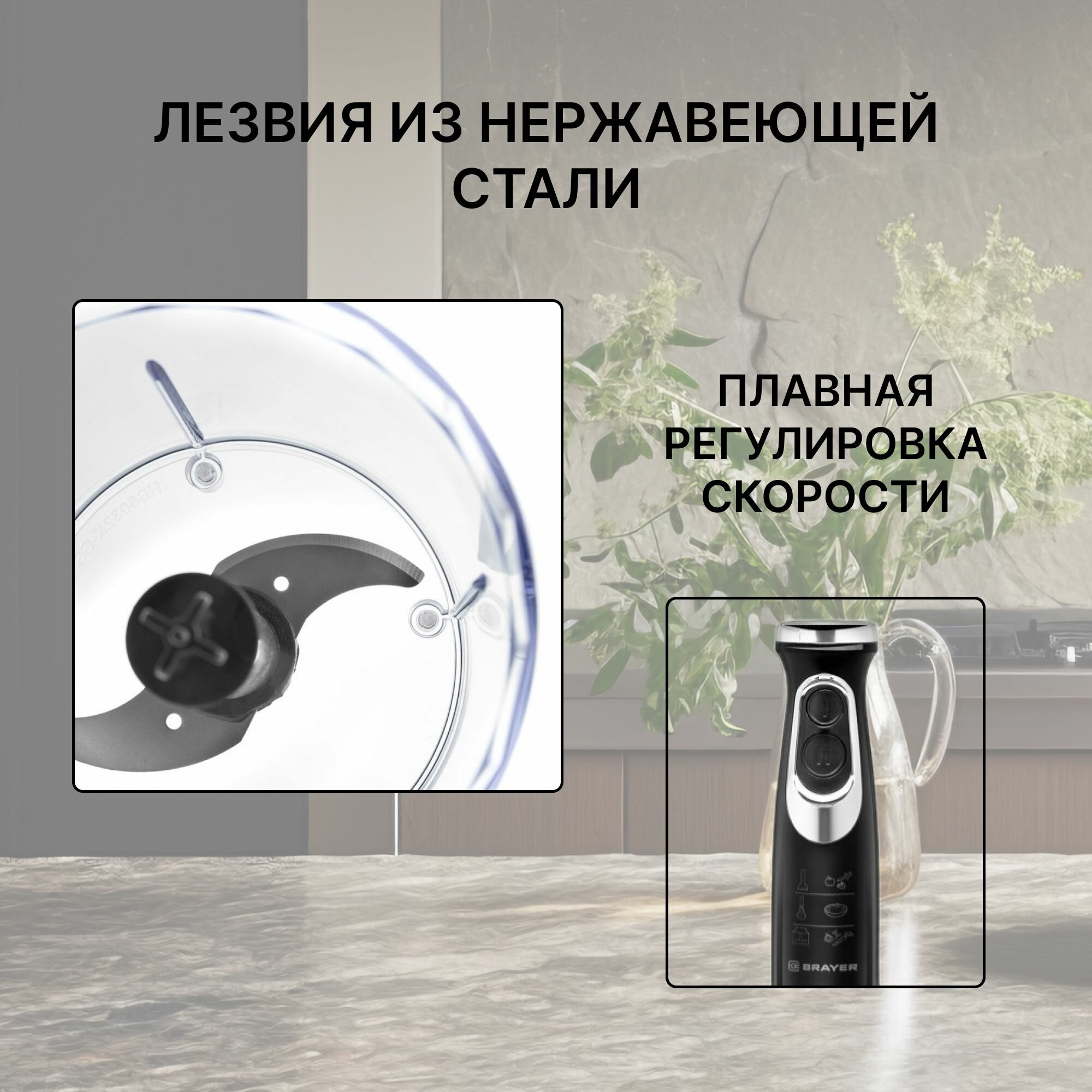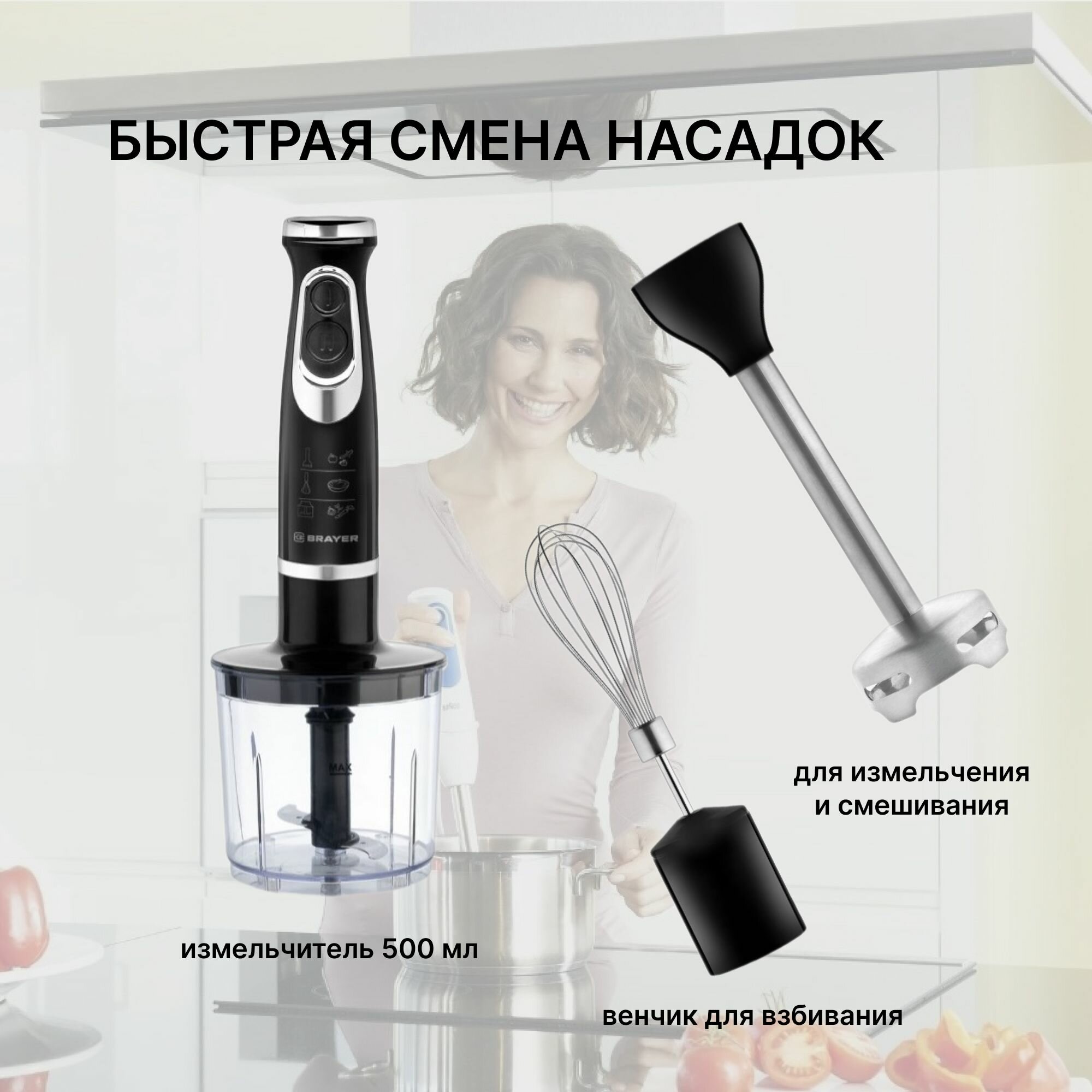 Блендер BRAYER BR1240 погружной, 800 Вт, нержавеющие лезвия, 2 скорости, плавная регулировка, венчик, измельчитель 350 мл