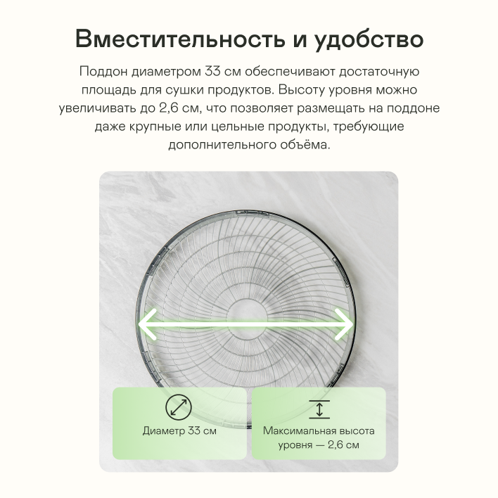 1. В целом сушилка сделана очень качественно, ничего за это время не разломалось 2. Пробовали сушить много всего, и яблоки, и бананы, и киви, и дыню. По качеству претензий нет, единственное иногда приходится уровни переставлять, чтобы не пересушивал 3. Пастилу не делали, но подон для неё в комплекте есть 4. У сушилки 3 уровня разбираются, поэтому можно ставить высокие банки с йогуртом на сушку 5. Места в ней достаточно много, чтобы все продукты разложить |