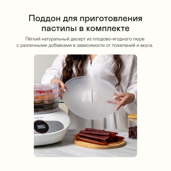 В комплекте идет поддон для пастилы, купила ещё три дополнительно. Очень довольна приобретением |