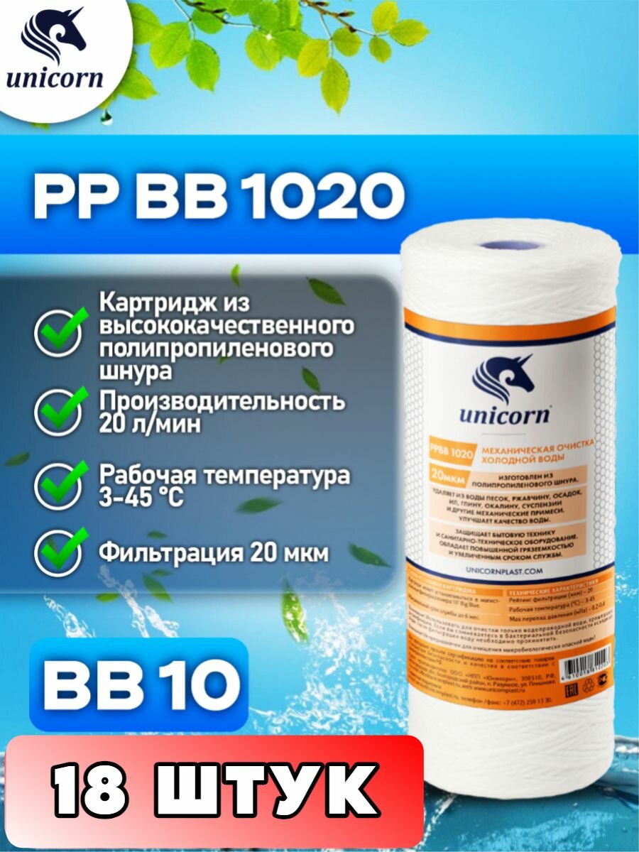 СохранитьКартридж для фильтра воды механическая очистка из полипропиленового шнура для холодной воды типоразмер 10"ВВ (Big Blue) фильтрация 20 микрон Unicorn PPBB1020 18 штук (одна коробка) интересное: