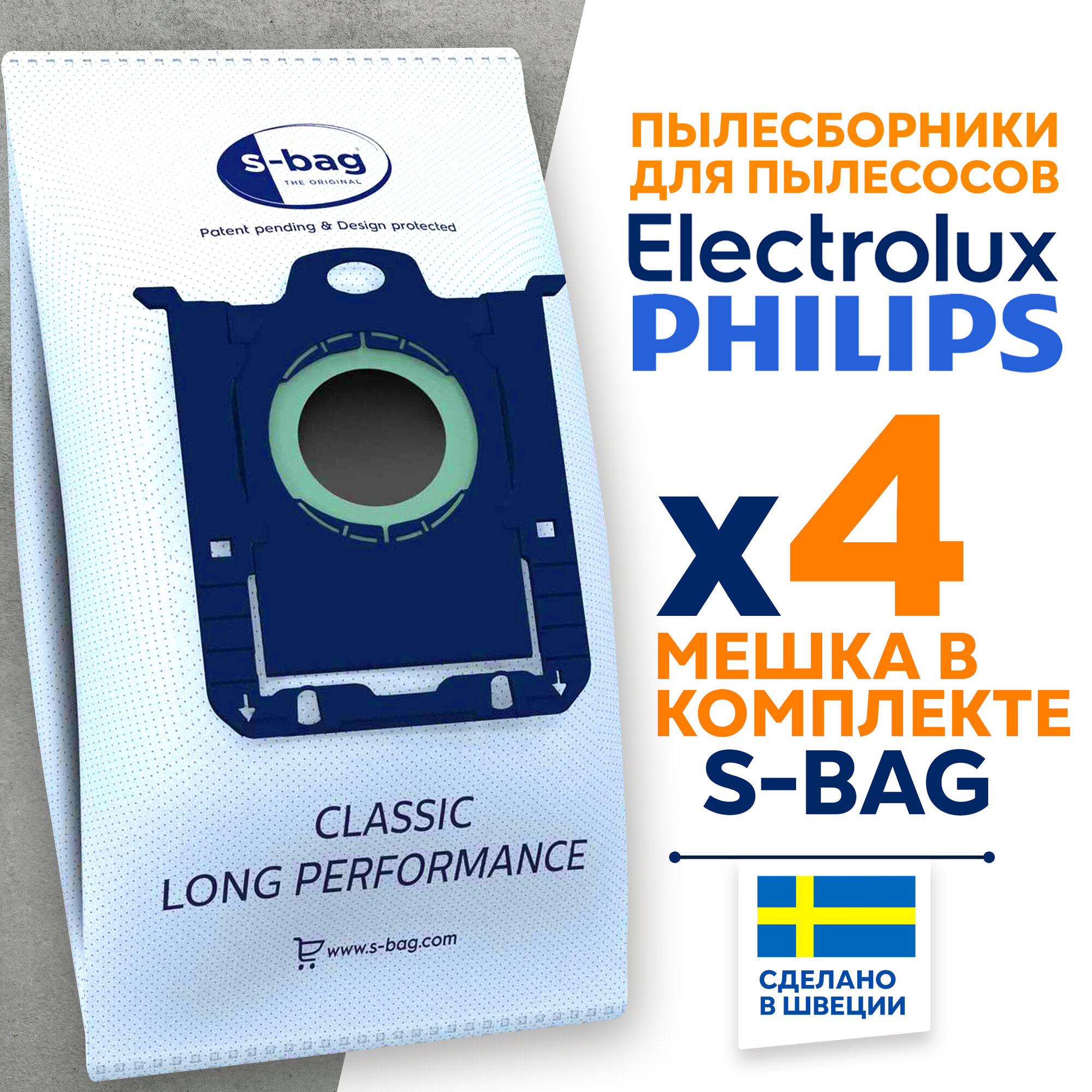 Мешки для пылесосов Philips и Electrolux E201S S-Bag Classic Long Performance, 4 шт
