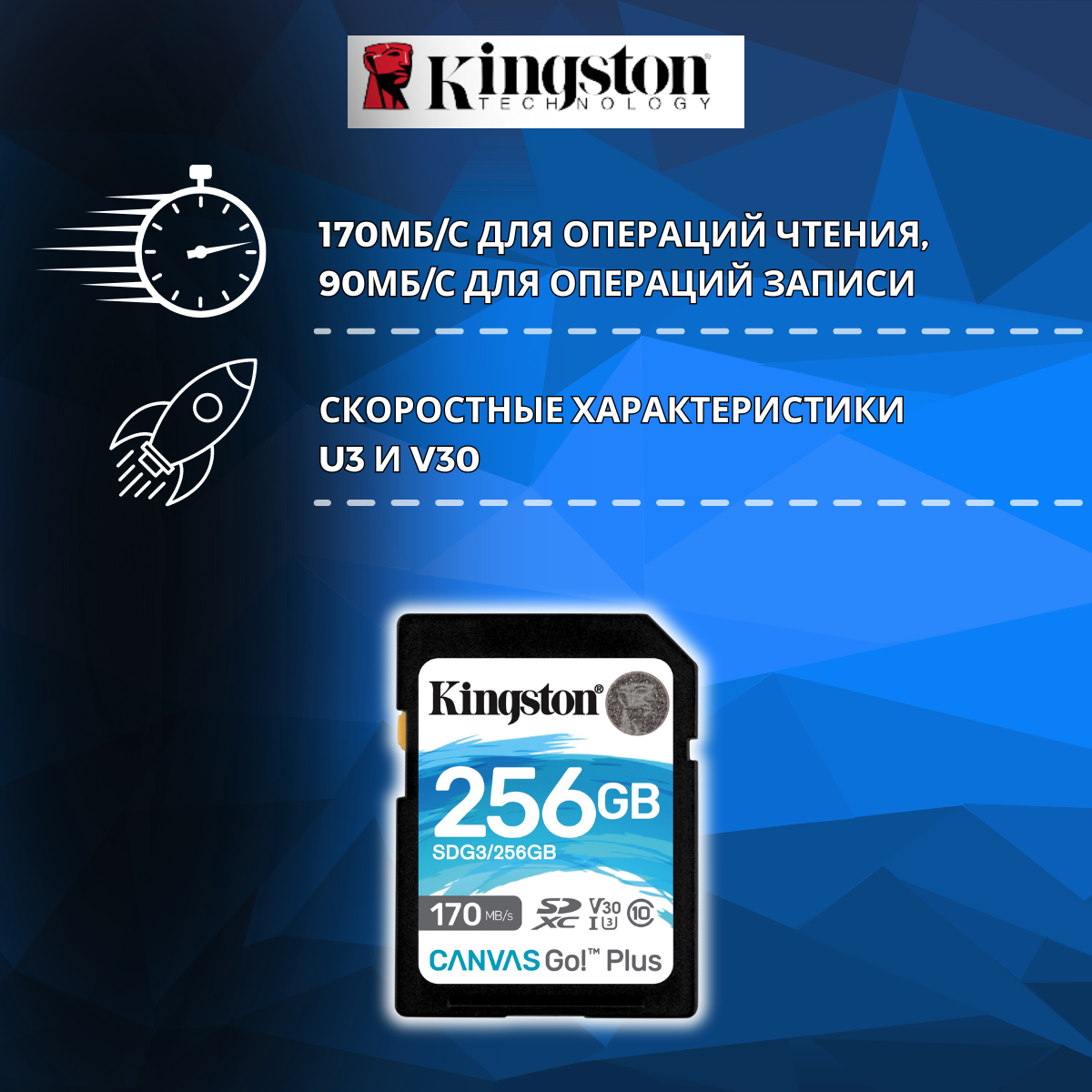 Карта памяти Kingston Canvas Go! Plus SDG3/256GB Class 10, 256Gb, SDXC, UHS-I U3 A2 V30, запись: 90 Мб/с, чтение: 170 Мб/с