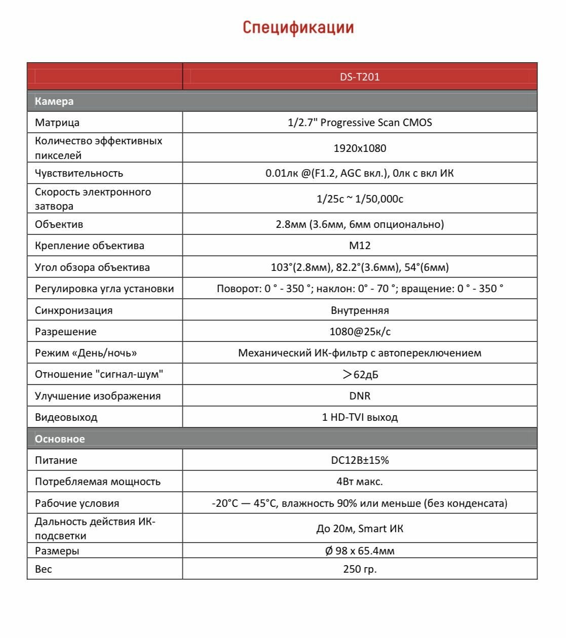 Видеокамера HiWatch DS-T201(B) 2Мп с ИК-подсветкой до 20м 1/2.7" CMOS матрица, 2.8мм, 103°, механический ИК-фильтр, 0.01 Лк F1.2, OSD, DWDR, BLC, DNR