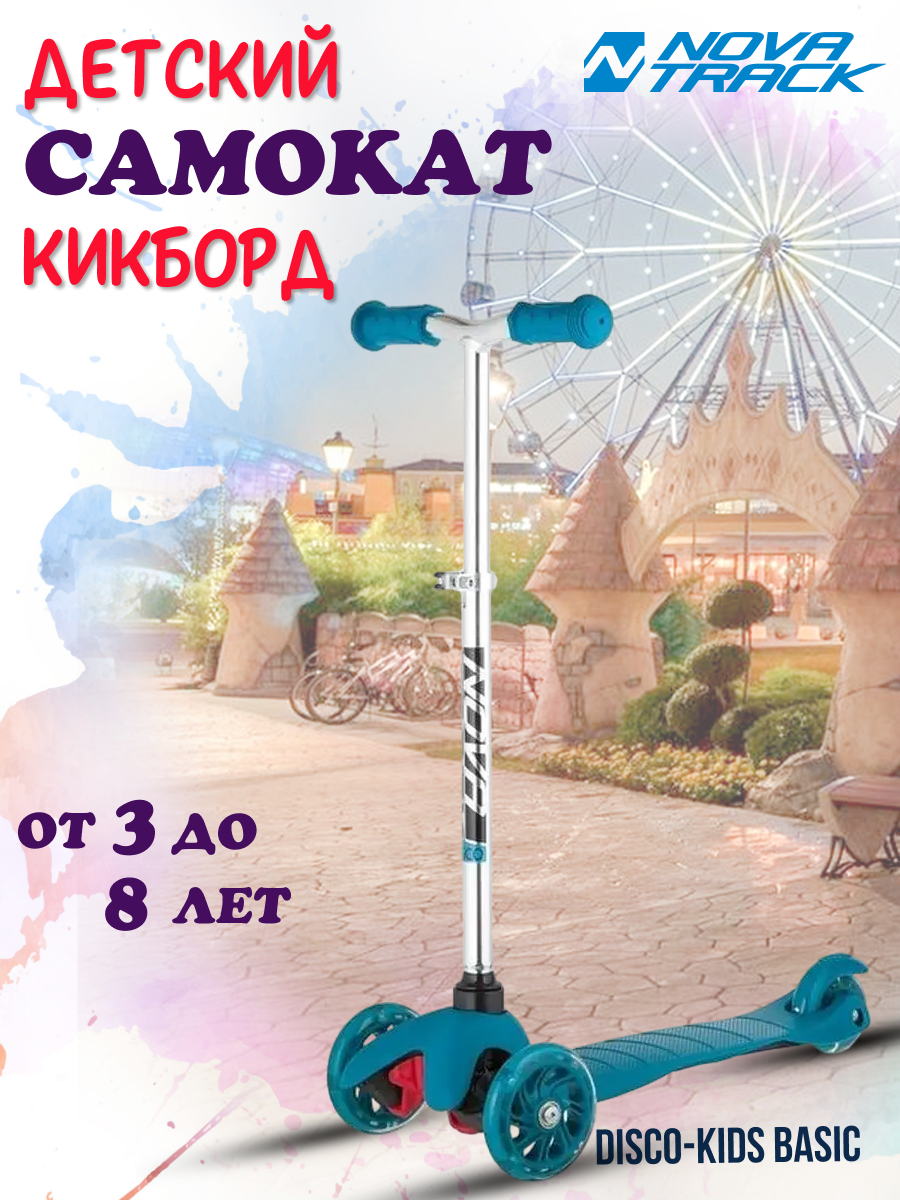 Купить Самокат Novatrack Disco-kids Basic для детей, свет.колеса PU пер.120*24 задн.76*24мм, эргономичный быстросъемный Y-руль с нескладными рукоятями, регулируемый по высоте, бирюзовый