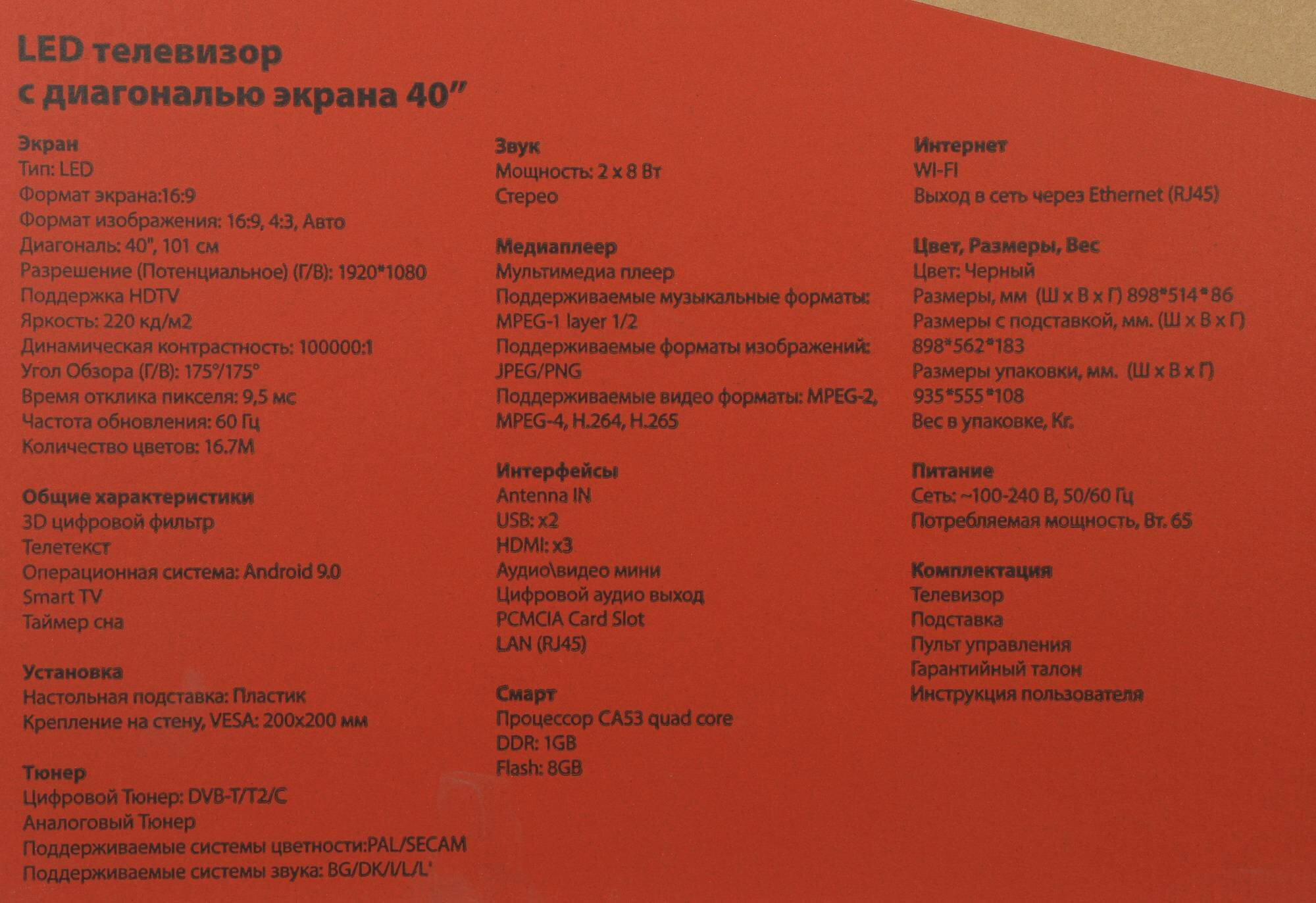 | Диагональ | 40 дюйм |