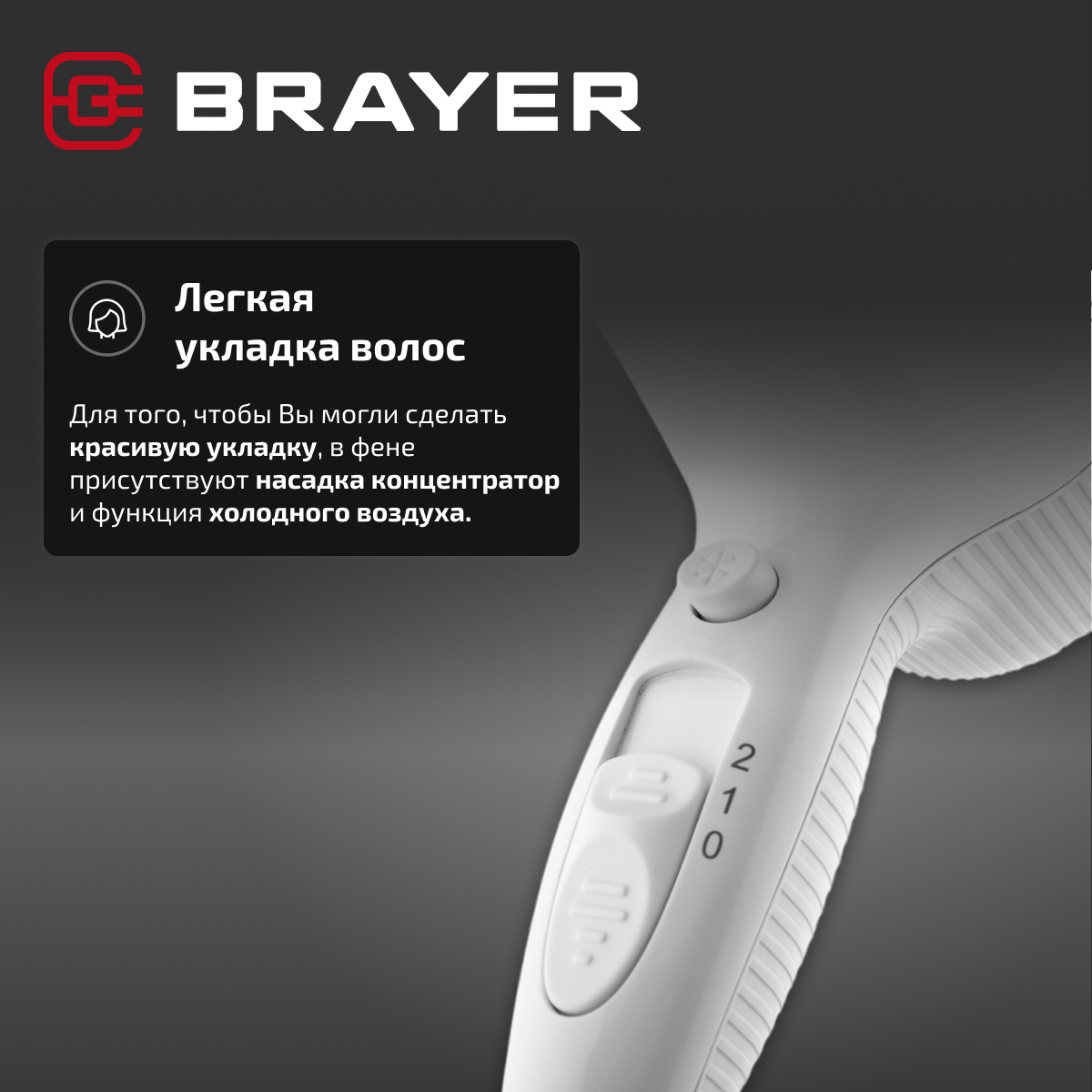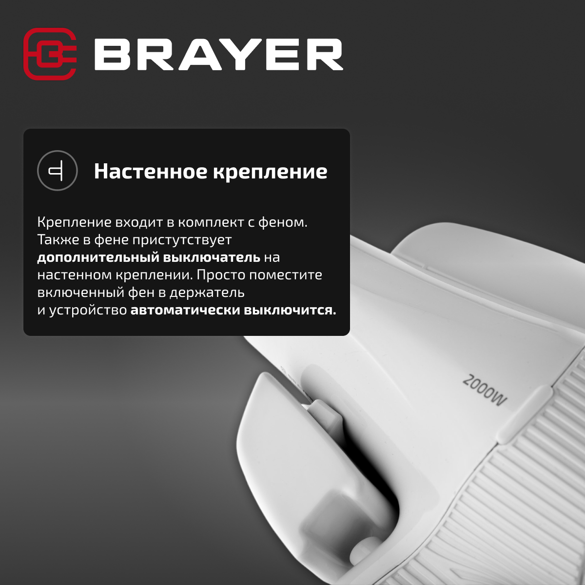 Фен настенный Brayer Br3021bk, 2000, 2 скор, 2 реж нагрева, концентратор, холод, 1,8 м, Br3021bk .
