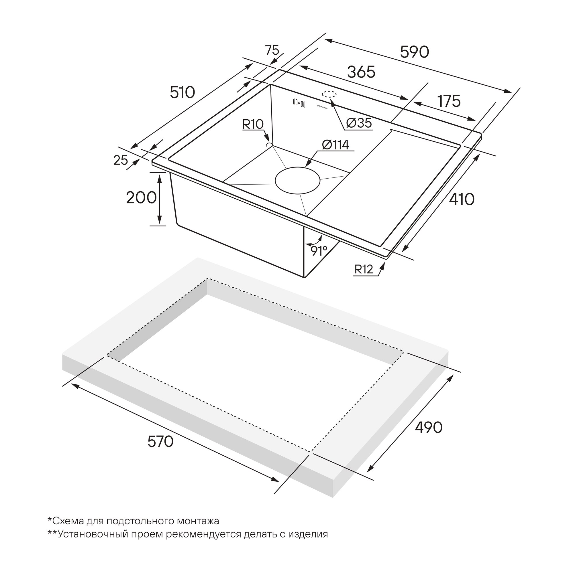 Мойка для кухни из нержавеющей стали Paulmark KRONER 59 590х510 мм, PVD покрытие, отверстие под смеситель, врезная, подстольная и вровень со столешницей, цвет вороненая сталь