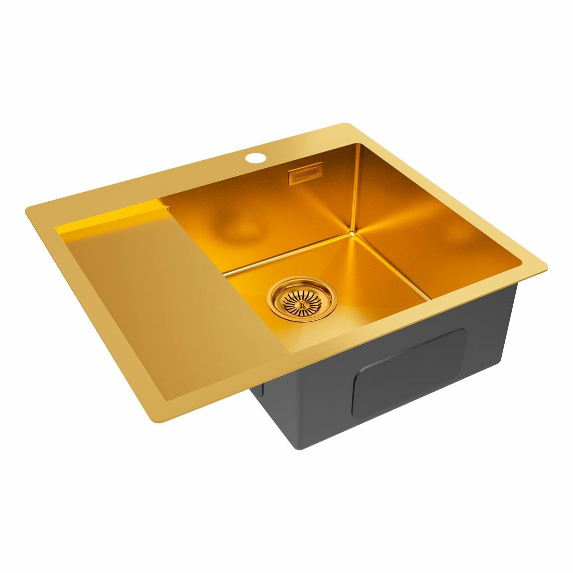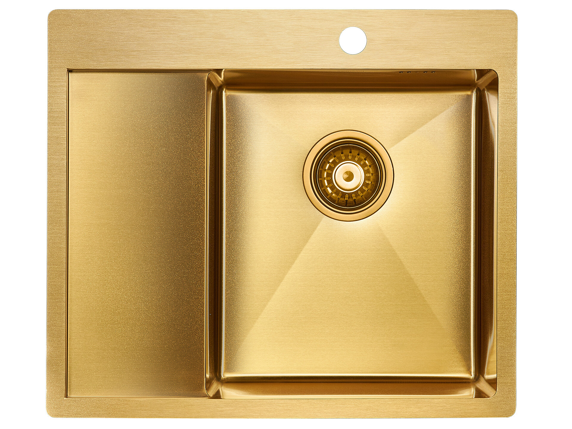 Мойка для кухни из нержавеющей стали Paulmark KRONER 59F, 590х510 мм, мойка слева, PVD покрытие, отверстие под смеситель, врезная / вровень со столешницей, цвет брашированное золото