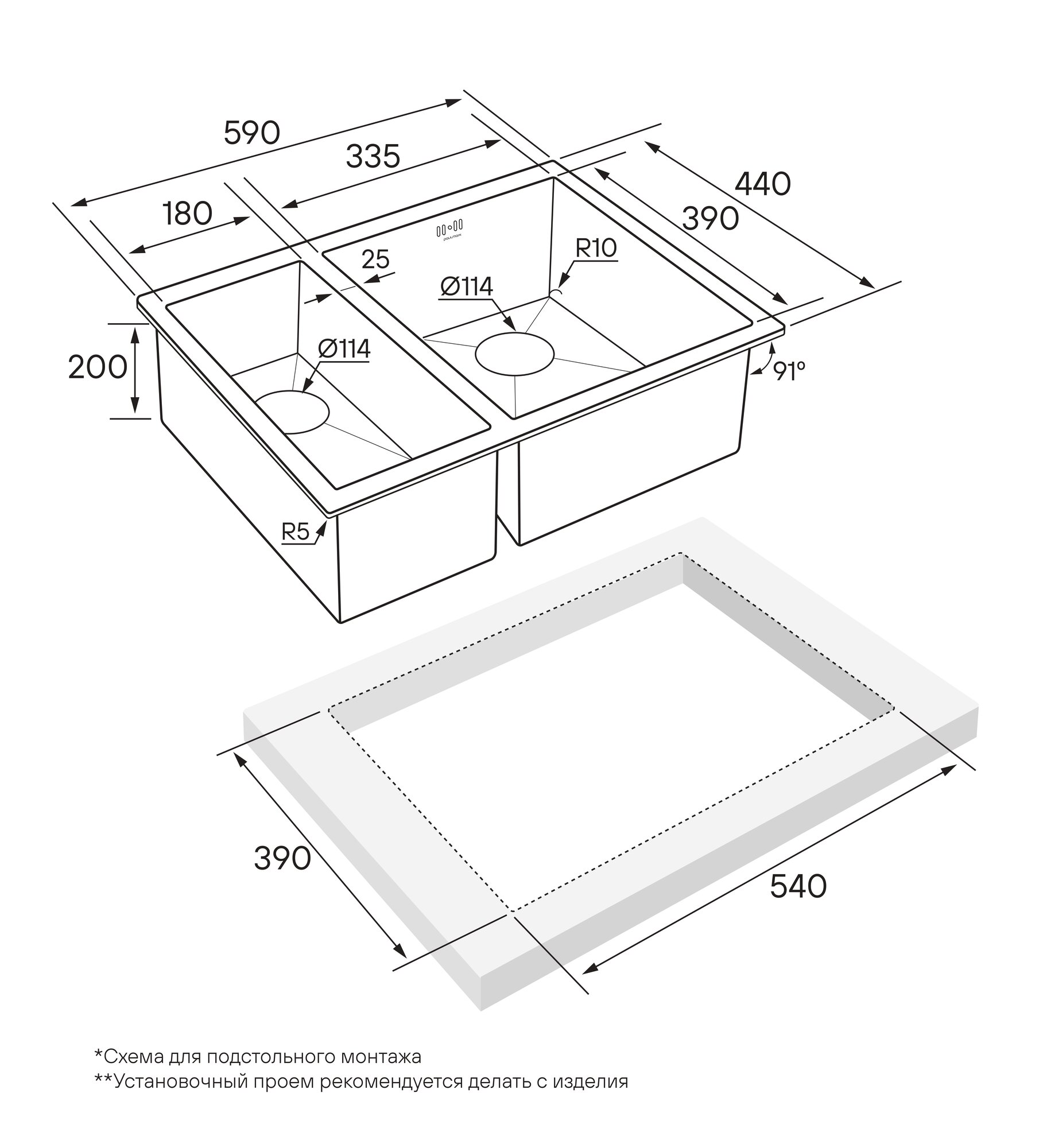 Мойка для кухни из нержавеющей стали Paulmark KRONER-PRO 59, 590х510 мм, 2 отверстия: под смеситель и дозатор, монтаж: вровень со столешницей / врезной, цвет вороненая сталь