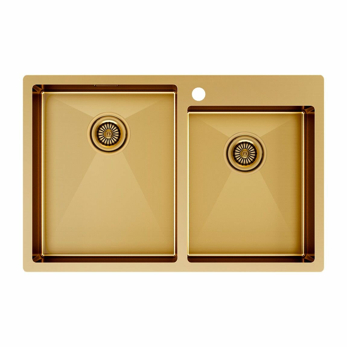 Купить Мойка для кухни из нержавеющей стали Paulmark KRONER 78/2S, 780х510 мм, PVD покрытие, крыло справа, шумопоглащающее покрытие, врезная / вровень со столешницей, цвет брашированное золото