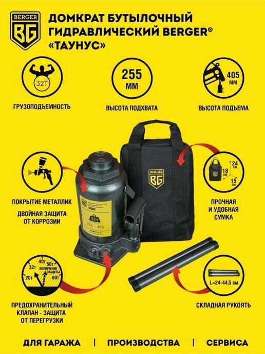 Домкрат бутылочный гидравлический 32т. ''Таунус'', 255-405 мм BERGER BG1303