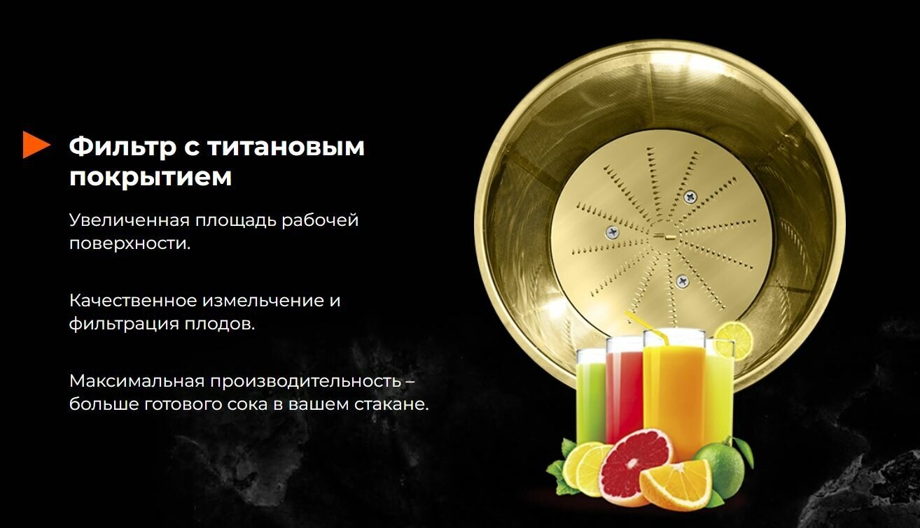 Мощность здесь и правда впечатляет. И она вся уходит в дело. Соки можно выжимать практически в любом объёме. Есть здесь несколько скоростей отжима, так что под любой фрукт, овощ можно подобрать оптимальную. Тем самым выжимается почти всё до последней капли. Это конечно удивляет. Горловина для загрузки у неё большая и можно помещать практически любой плод целиком. При всей своей огромной мощности работает она не очень громко. Для ушей вполне комфортно. Материалы очень качественные. Сам корпус сделан из хорошего металла. Отдельно выделю фильтр. Он здесь стальной с титановый покрытием. Можно сказать что он фактически вечный. Управление электронное и очень удобное. Дисплей яркий и читается на нём всё очень хорошо. Есть все современные меры защиты, что конечно же плюс. Разбирается эта соковыжималка очень легко и удобно её мыть. Стоит она устойчиво на поверхности. Плюс ещё очень стильный и необычный дизайн. Своих денег она точно стоит. |