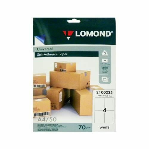 Самоклеящаяся бумага Lomond A4, белая, 4 деления (105 x 148.5 мм), 70 г/м2, для этикеток, универсальна, 50 листов (2100025)
