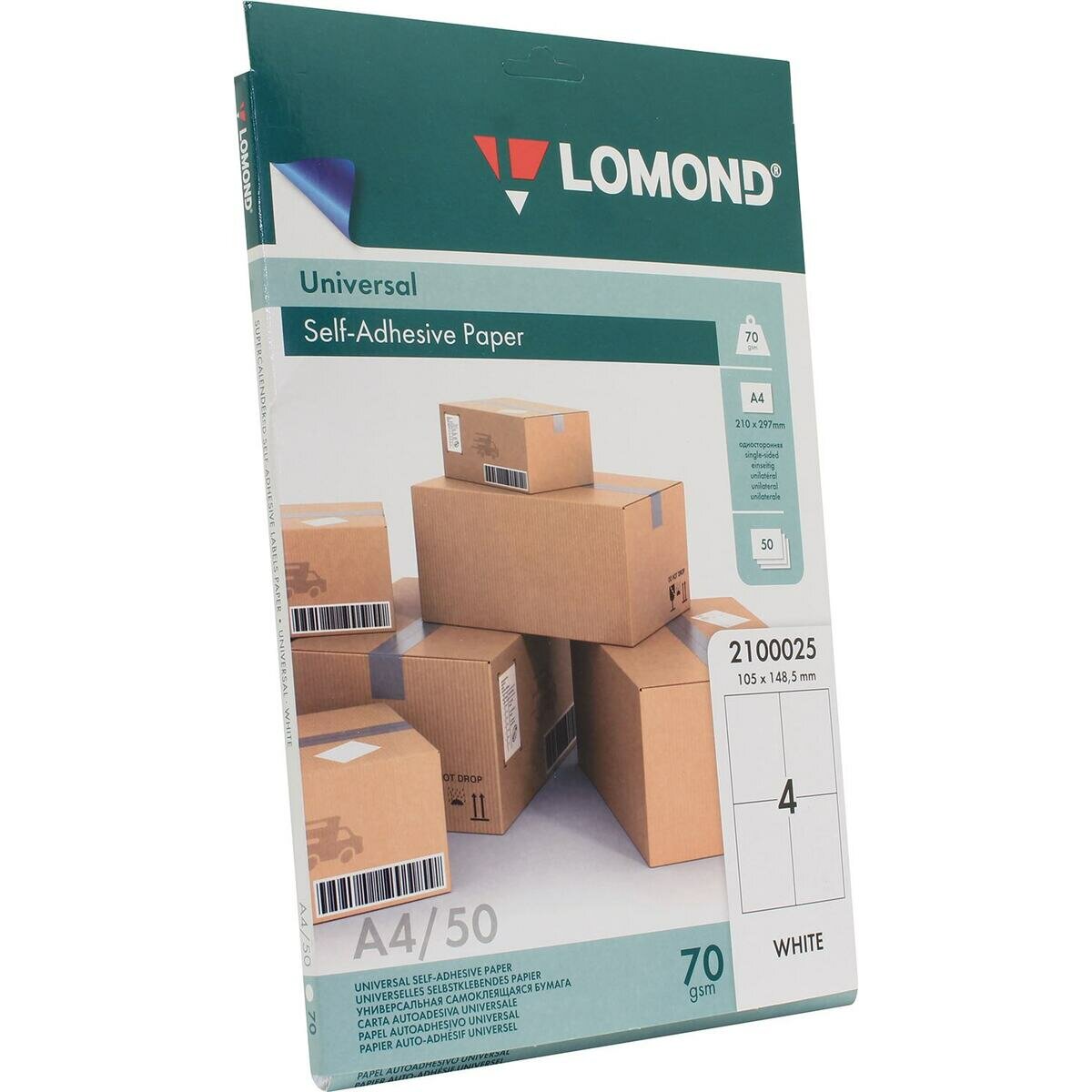 Этикетка самоклеящаяся 105х148,5 мм, 4 этикетки, белая, 70 г/м2, 50 листов, LOMOND, 2100025, 122808