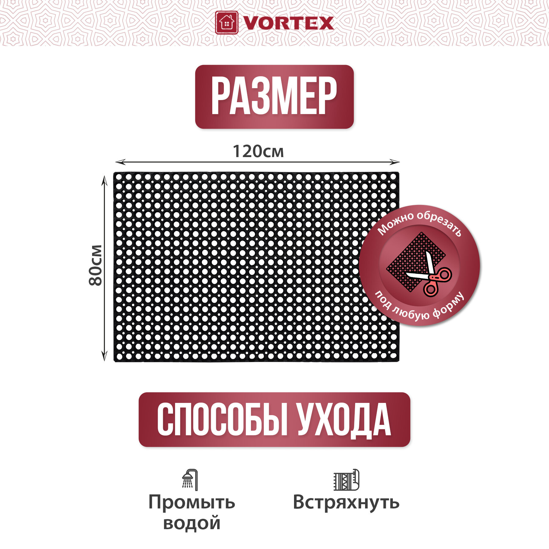 Коврик входной резиновый крупноячеистый грязезащитный, 80х120 см, толщина 16 мм, черный, VORTEX, 20003, 601704