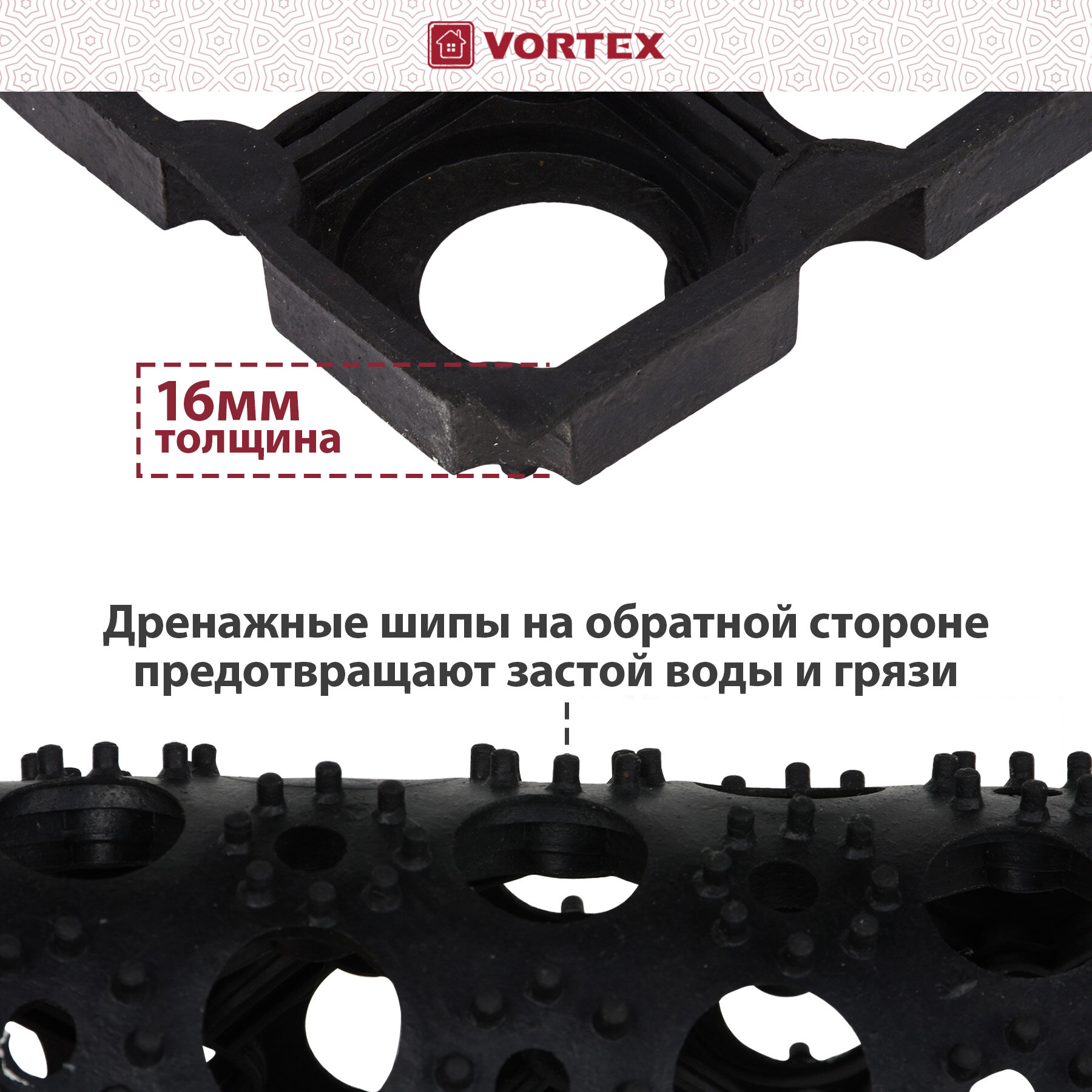 Коврик входной Vortex резиновый крупноячеистый грязезащитный, 50х100 см, толщина 16 мм, черный