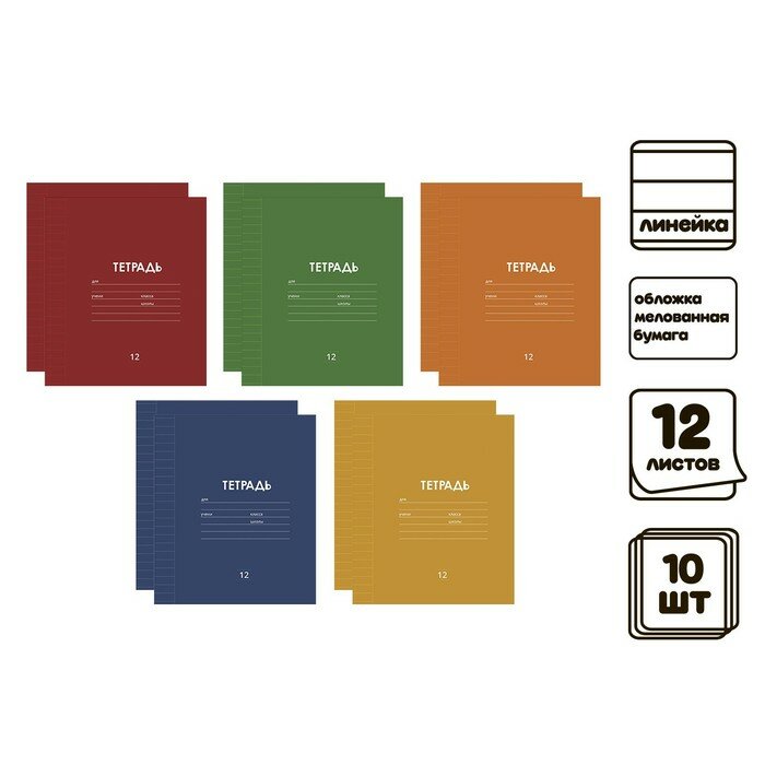 Купить Комплект тетрадей из 10 штук, 12 листов в линию Calligrata "Однотонная Классика Линовка", обложка мелованная бумага, ВД-лак, блок офсет, 5 видов по 2 штуки