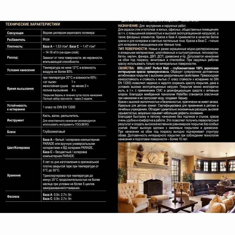 Краска интерьерная Brilliant perfect matt Parade Deluxe База С (бесцветный) 9 л