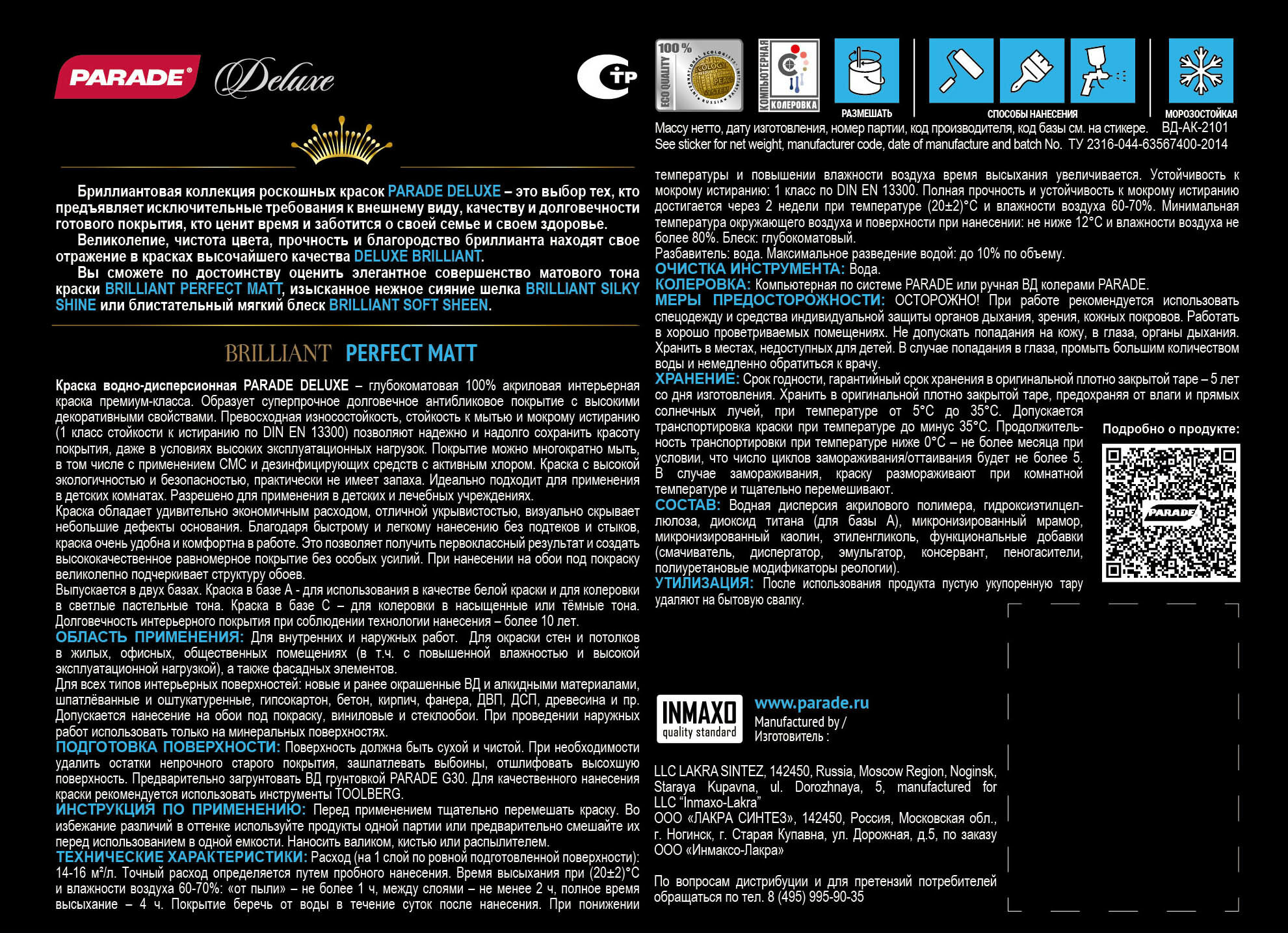 Ниже Вы можете прочитать отзывы на Краска PARADE DELUXE Brilliant perfect matt База С 0_9л, ознакомится с подробными характеристиками, посмотреть интересные обзоры и фотографии на Краска PARADE DELUXE Brilliant perfect matt База С 0_9л.