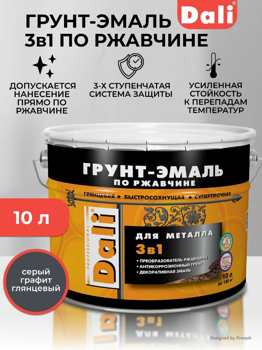 Dali / Дали Грунт-эмаль по ржавчине 3 в 1 гладкая алкидная RAL 7004 серый 10л