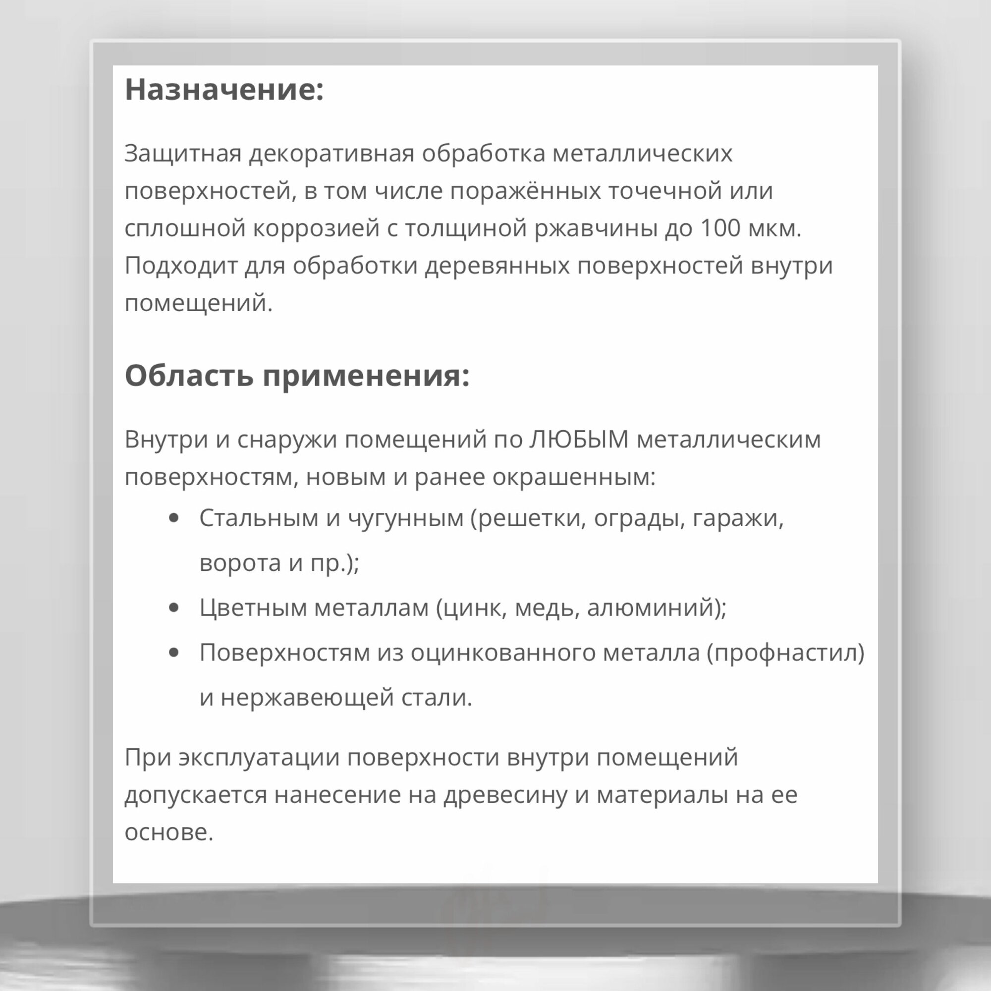 Из минусов - при окраске кистью какой-то огромный расход, у меня вышел в 2 раза выше чем максимальный из инструкции. Там куда должно было хватить 1,5 банки, не хватило двух. Рекомендовал бы купить преобразователь ржавчины отдельно и обработать после минимальной механической очисткой перед окраской, благо он стоит копейки, тогда и расход будет меньше и держаться будет лучше |