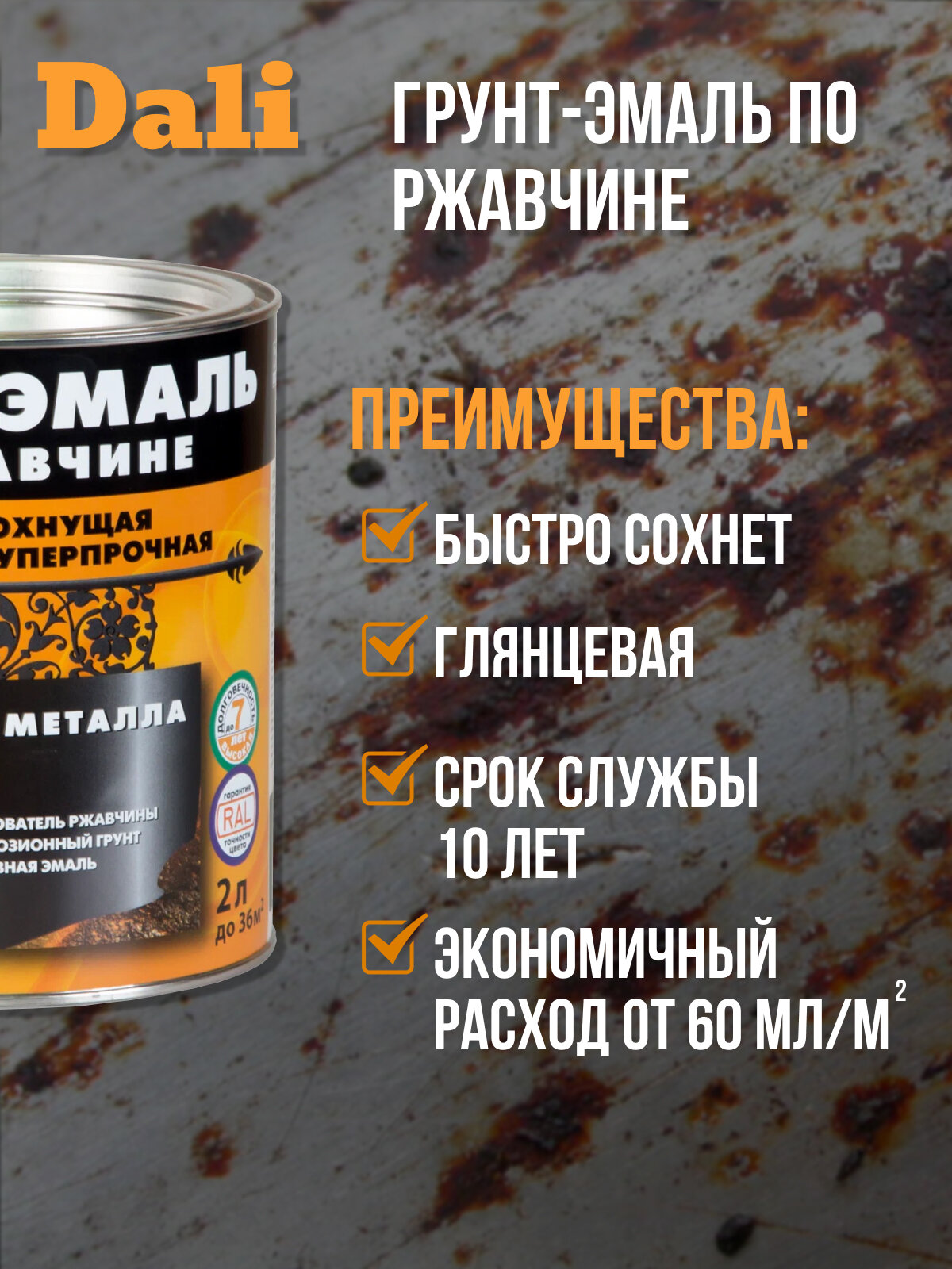 СохранитьГрунт-эмаль по ржавчине 3 в 1 гладкая Dali 2 л оранжевый (RAL 2004) интересное:
