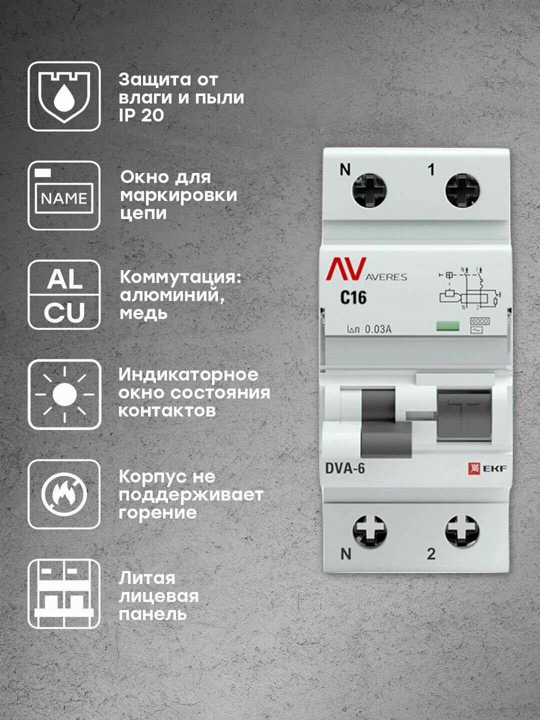 Автомат дифференциальный DVA-6 1P+N 16А (C) 30мА (AC) 6кА AVERES , EKF RCBO6-1PN-16C-30-AC-AV (1 шт.)