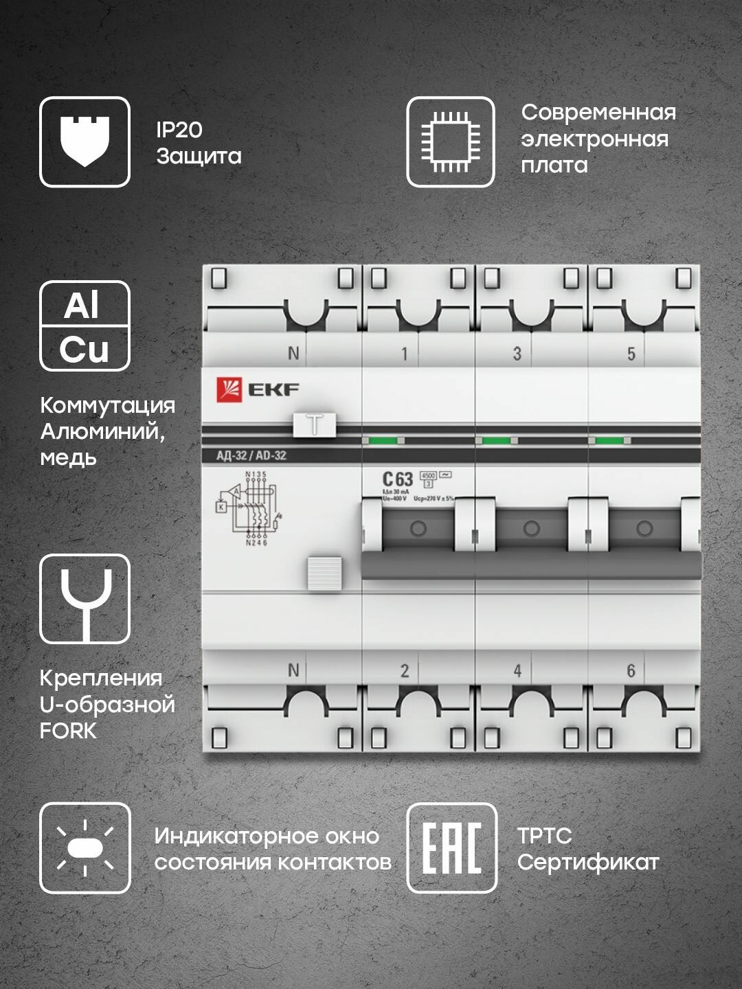 Дифференциальный автоматический выключатель АД32 3 полюс+N, 63А, Тип AC, х-ка C, 30мА DA32-63-30-4P-pro EKF