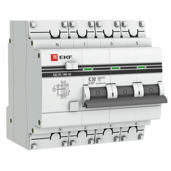 Выключатель автоматический дифференциального тока 3п+N C 32А 30мА тип AC 4.5kA АД-32 PROxima, EKF DA32-32-30-4P-PRO (1 шт.)