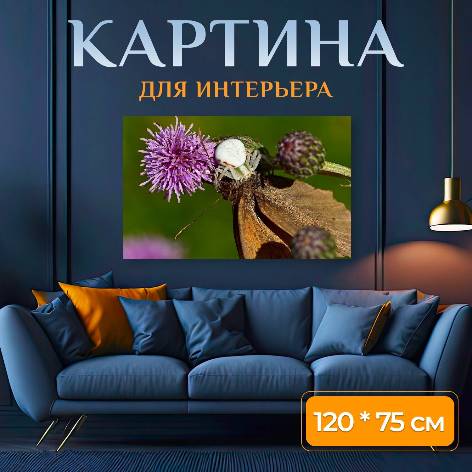 Купить Картина на холсте "Крабовый паук, бабочка, добыча" на подрамнике 120х75 см. для интерьера