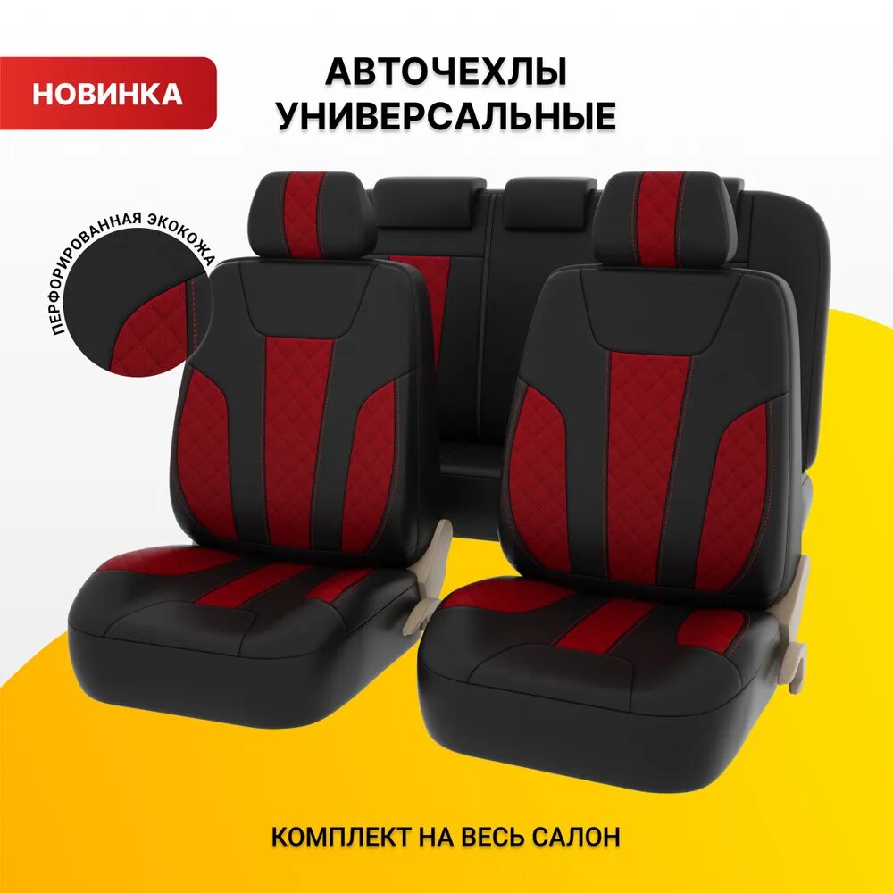 Чехлы в машину универсальные PSV Lotos Next (Черный/Ромб красный/отстрочка красная), ромб + экокожа