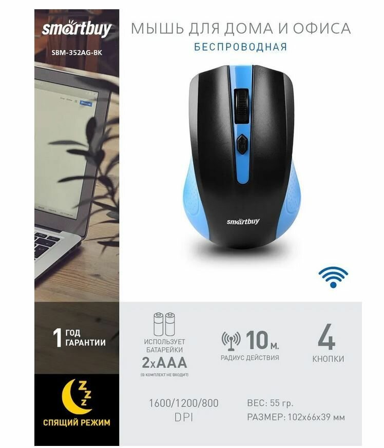 Мышь беспроводная SmartBuy ONE SBM-352AG-BK, синий/чёрный (USB)