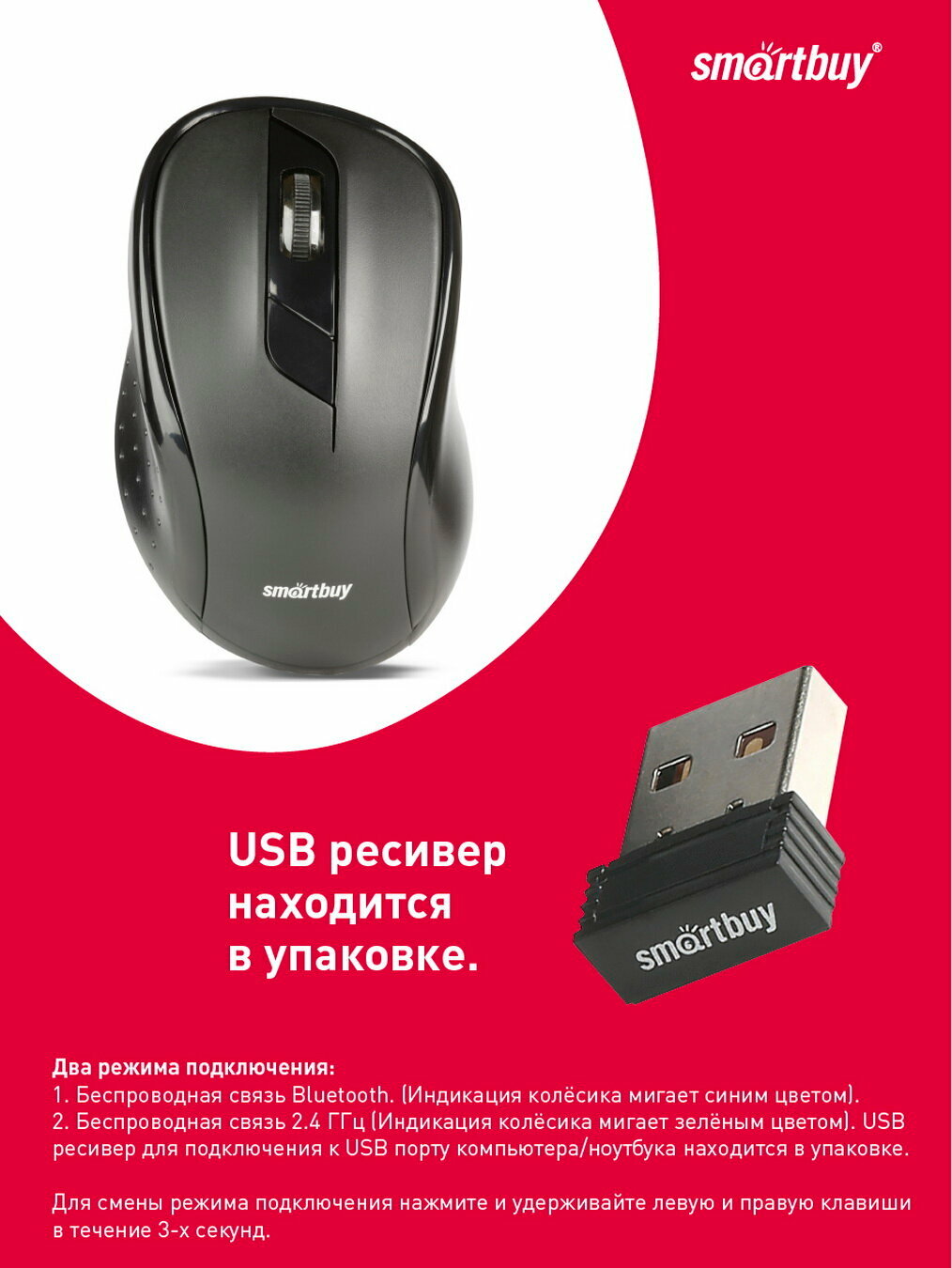Мышь беспроводная Dual Bluetooth+USB Smartbuy 597D (SBM-597D-R), красный