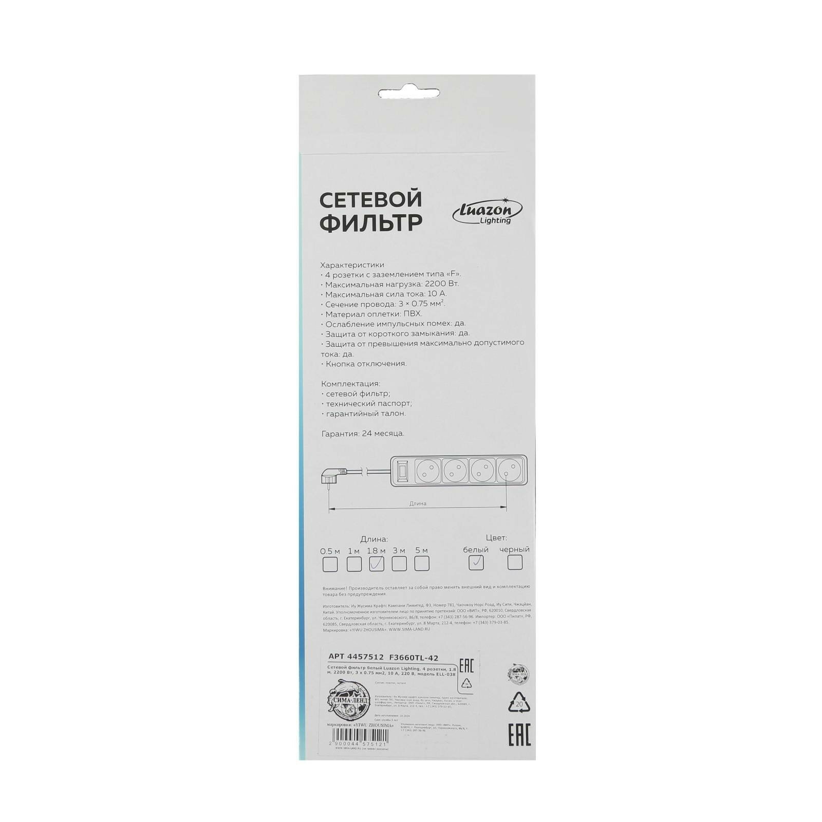 Luazon Lighting Сетевой фильтр Luazon Lighting, 4 розетки, 1.8 м, 2200 Вт, 3 х 0.75 мм2, 10 А, 220 В, белый
