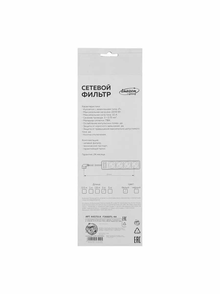 Сетевой фильтр Luazon Lighting, 4 розетки, 3 м, 2200 Вт, 3 х 0.75 мм2, 10 А, 220 В, белый 4457514