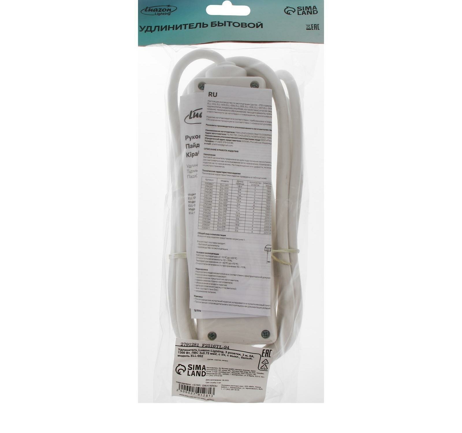 Купить Удлинитель Luazon Lighting, 3 розетки, 3 м, 6 А, 1300 Вт, 3х0.75 мм2, с з/к, с выкл., Б 2791281