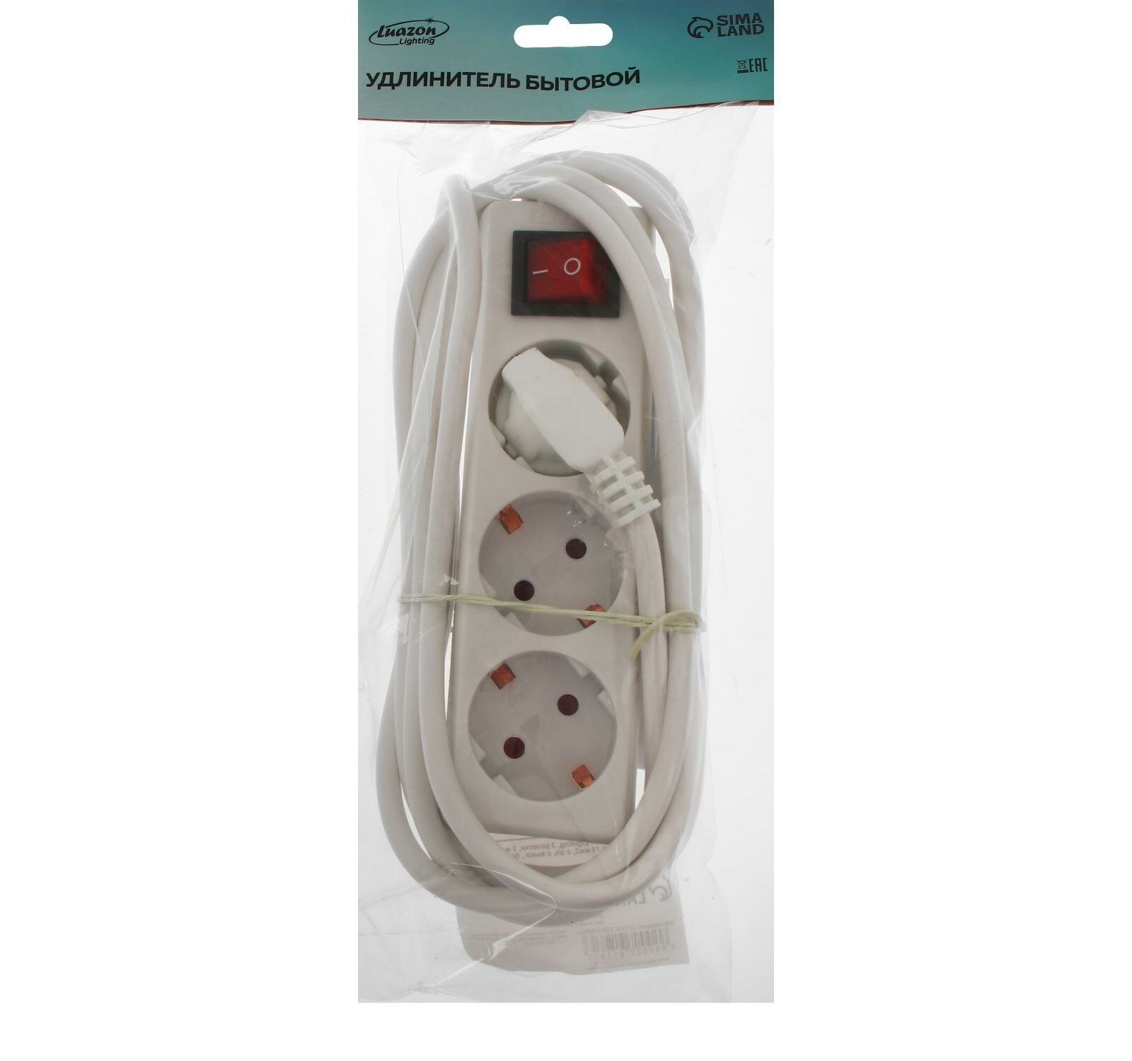 Удлинитель Luazon Lighting, 3 розетки, 5 м, 10 А, 2200 Вт, 3х1.5 мм2, с з/к, с выкл., Б 2791294
