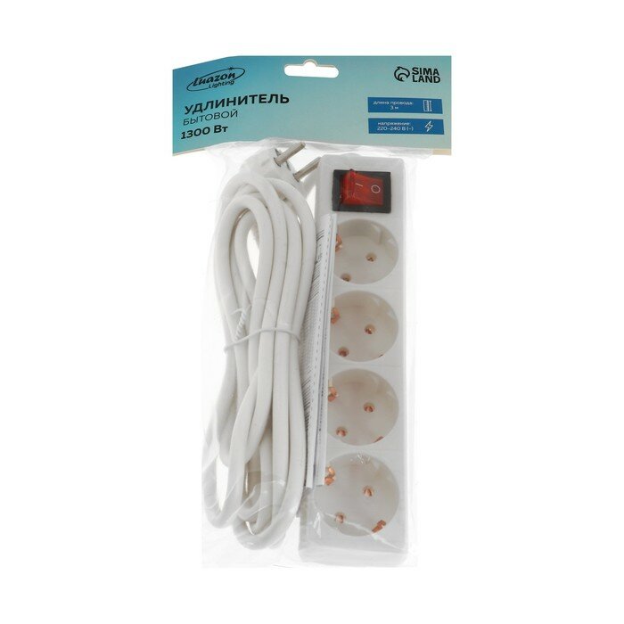 Купить Удлинитель Luazon Lighting, 4 розетки, 3 м, 10 А, 2200 Вт, 3х0.75 мм2, с з/к, с выкл., Б Luazon Ligh